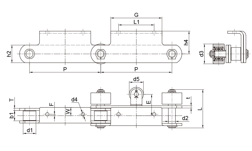 | 链号 | 节距 | 滚子直径 | 滚子直径 | 销轴直径 | 销轴长度 | 链板高度 | 附板尺寸 | 抗拉强度 |