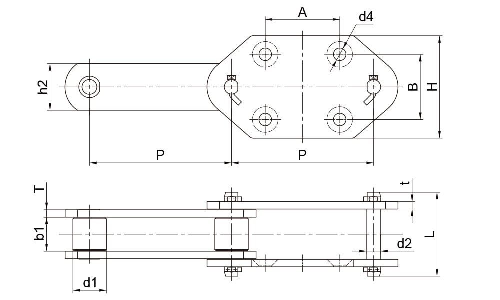 | 链号 | 节距 | 滚子直径 | 内节内宽 | 销轴直径 | 销轴长度 | 链板高度 | 附板尺寸 | 抗拉强度 |