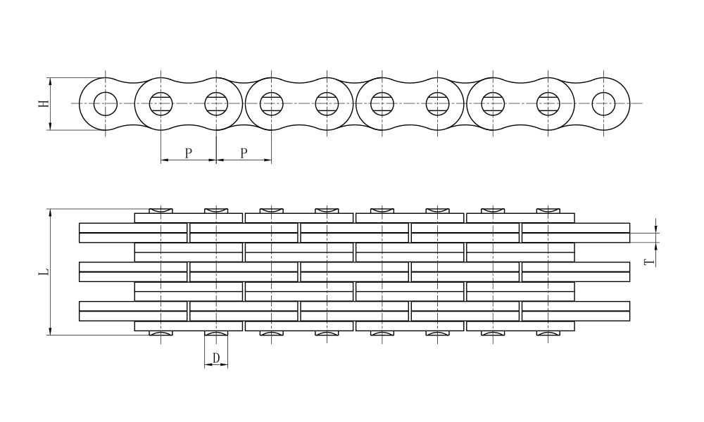 | 链号 | 节距 | 板数组合 | 内链板高度 | 链板厚度 | 销轴直径 | 销轴长度 | 抗拉强度 | 每米重量 |
