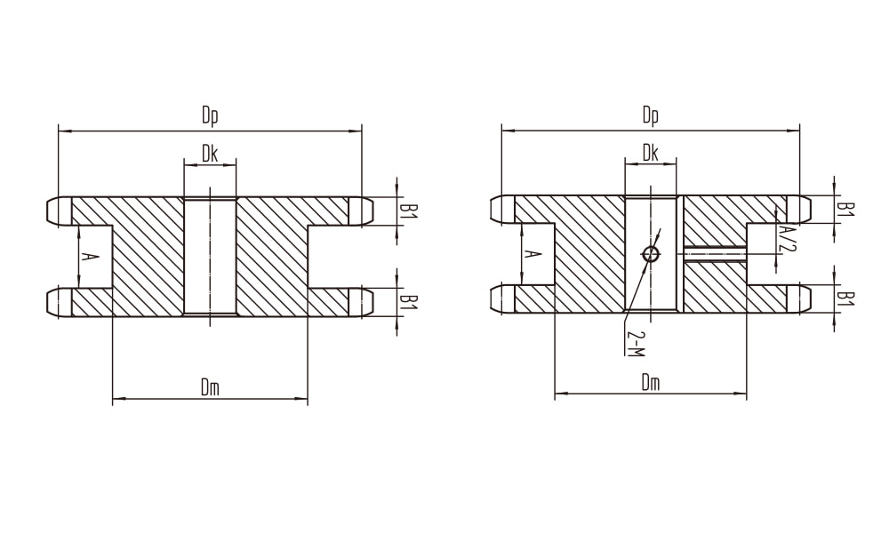 | 链号 | 齿数 | 节圆径 | 齿顶圆 | 最大孔径 | B型总厚度 | 排距 | 凸缘 | 齿厚 |